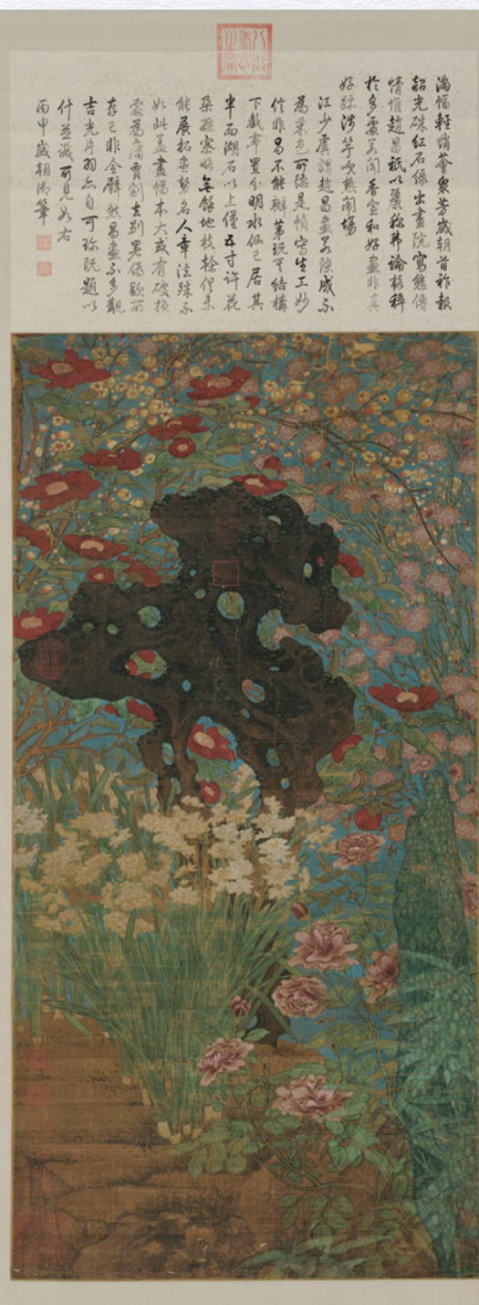 (辉辉灯火曙光连,气淑风条景物鲜) 每逢交年换新岁,人们总是对新的一年满怀美好期待。说到古时“新年”,我们脑海里会浮现《荆楚岁时记》中“拜贺君亲”的温馨场景,抑或是《东京梦华录》里“禁中爆竹山呼”的盛世欢腾 -从市井街巷到宫廷禁苑,处处洋溢着辞旧迎新的喜庆氛围。由此衍生的岁朝吉庆题材在中国绘画史上蔚为大观。北宋赵昌的这幅绢本立轴设色《岁朝图》正是其中的经典之作。此画以重彩没骨法绘成,将人间富