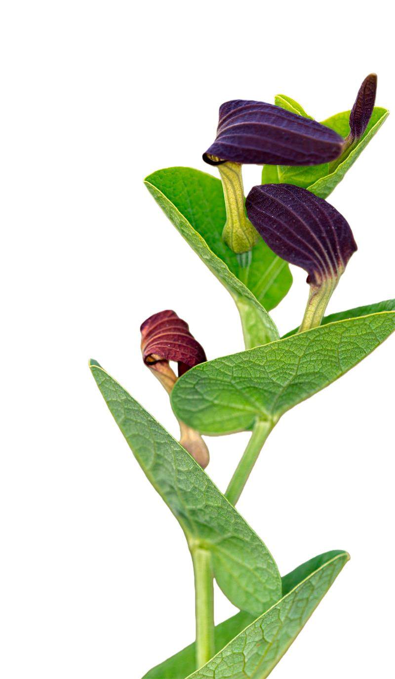 马兜铃 马兜铃是马兜铃科马兜铃属的草质藤本植物,因果实形似马颈下悬挂的铃铛而得名。其根为圆柱形,外皮黄褐色;茎柔弱,呈暗紫色或绿色,有腐肉味。叶纸质,卵状三角形、长圆状卵形或戟形。花单生或2朵聚生于叶腋,花形奇特。蒴果近球形,顶端微凹,具6棱,成熟时为黄绿色,并由基部向上沿室间6瓣开裂;种子扁平,钝三角形,边缘具白色膜质宽翅。花期在7—8月,果期在9—10月。 马兜铃的花为管状,没有花萼与花冠