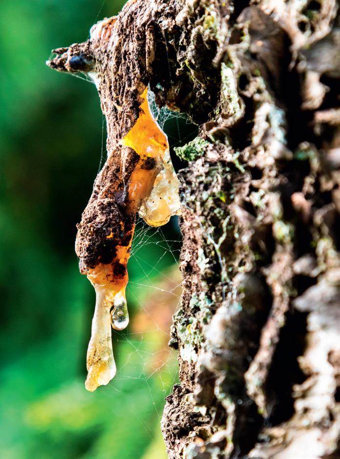 松树滴落的“油”并非真正的油脂,而是树体分泌的树脂。松树内部布满树脂道,一旦树皮因风雪刮擦、动物啃咬、修剪等出现破损,树脂就会迅速流出,以防体内水分流失。松树滴“油”的现象在夏季很常见。这是因为高温会让树脂分泌活跃、质地变得稀松、流动性增强。到了冬季,松树滴“油”的现象大为减少,但并非完全消失。尤其在昼夜温差较大的天气,白天的升温会让树脂变稀、软化流动,顺着破损处流出;到了夜间,这些流出的树脂会因