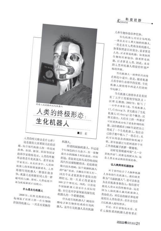 2015—2016 学年云南省德宏州芒市一中高二下学期期末语文试卷 (选自《百科知识》2009 年02A,有删改) 阅读下面的文字,完成问题。 人类的终极形态:生化机器人生化机器人 白石 由微电子和生物体组成,具有集合任何生物体的各种优势。可分为两类,一是具有人类大脑的机器人,二是具有人类肉身的机器人。按意识分,前者算是人类,后者算是机器;按生物组织分,前者算是机器,后者算是人类。
