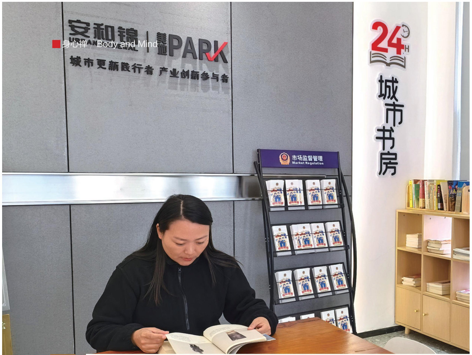 深夜十点,当南环西路上的车流逐渐稀疏,当美地PARK产业园的咖啡馆熄灭最后一盏灯,一束暖光却从街角一处玻璃窗里漫出。产业园的24小时城市书房最近开了,近50平方米的空间内,木质书架倚墙而放,300余册书籍静立书架之上。一位刚下晚班的年轻人推门而入,找个靠窗的位子坐下,从书架上拿了一本介绍苏州地方文化的书。几乎同时,隔壁园区从事直播运营的“90后”女弦也走了进来,轻车熟路地选了一本创业指南类书籍