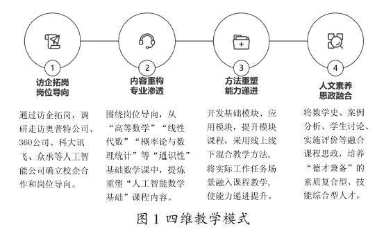 摘 要:针对专业基础课普遍存在的岗位导向模糊、专业渗透不足、教学方法传统、思政融合缺失等问题,本研究以“人工智能数学基础”课程为例,构建“岗位导向—专业渗透—能力递进—思政融合”四维教学改革模式。通过校企合作明确岗位需求,重构课程内容体系,创新混合式教学方法,融入思政元素,形成“教、学、做、创”一体化教学体系。实践表明,该模式显著提升了学生的数学应用能力与综合素养,为高职院校专业基础课程改革提供