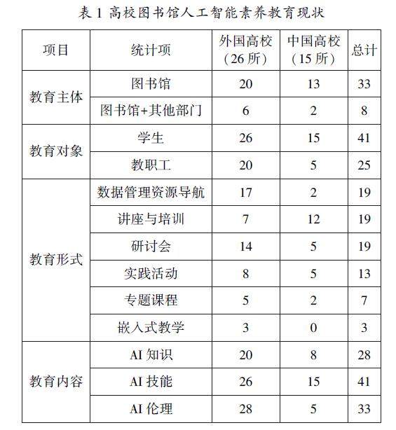 摘 要:[目的/意义]我国高校图书馆人工智能素养尚在起步阶段,了解国内外图书馆人工智能素养教育现状和问题对后续教育开展具有重要意义。[方法/过程]本文通过网络调查法、文献调查法,从教育主体、教育对象、教育内容、教育形式四个方面对国内外41所高校的素养现状进行深入调查。[结果/结论]研究发现,高校图书馆人工智能素养教育存在教育内容和框架不统一、教育队伍素养水平有待提高、教育主体单一、宣传质量不高的主