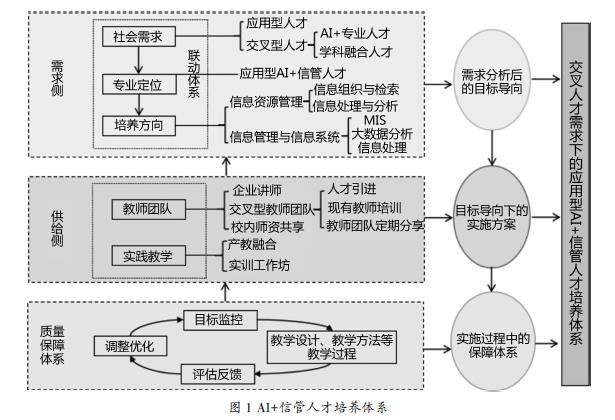摘 要:在人工智能(AI)技术高速发展和产业数字化转型的大背景下,社会对兼具AI与信息管理能力的复合型人才需求激增。本研究依据跨学科理论和人才培养适配性原则,针对当前“AI+信息管理”人才培养中课程体系不完善、实践教学环节薄弱、师资队伍跨学科能力欠缺及培养模式滞后等问题,基于教育目标分类学、建构主义学习理论等,构建了以培养目标为核心,涵盖课程体系、实践教学体系和质量保障体系的应用型人才培养体系。该