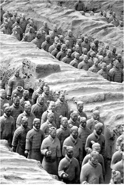 秦是历史上著名的军事强国,秦俑是古人“事死如事生”观念的体现,也是用“陈兵”的方式表现秦帝国的军事生活和武力。自商鞅变法以来,秦国就确立了奖励耕战的国策,培养“崇法尚武”的精神。凭借优良的装备、勇猛的战力,秦军成为一支“虎狼之师”,所向披靡。 秦军真实的阵列风貌 举世闻名的兵马俑分布在秦皇陵的三个陪葬坑中,显示出秦军真实的阵列风貌。目前发现陶俑8000件、战车百乘以及数万件实物兵器等文物,