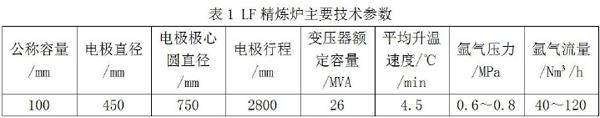 为实现公司提产降本要求,我厂钒钛铁水脱硫后提钒炼钢直上连铸工艺路线调整为钒钛铁水不脱硫直接提钒炼钢,上LF精炼炉脱硫后再上连铸工艺路线。生产钢种为建筑用螺纹钢。调整后的工艺路线可以减少钒钛铁水脱硫温度和金属料损失,增加铁水罐加废钢量,同时利用LF精炼炉升温功能,可以在半钢炼钢环节多加废钢,增加产量,降低成本。 一、LF精炼炉技术参数 我厂LF精炼炉技术参数见表1。 二、LF精